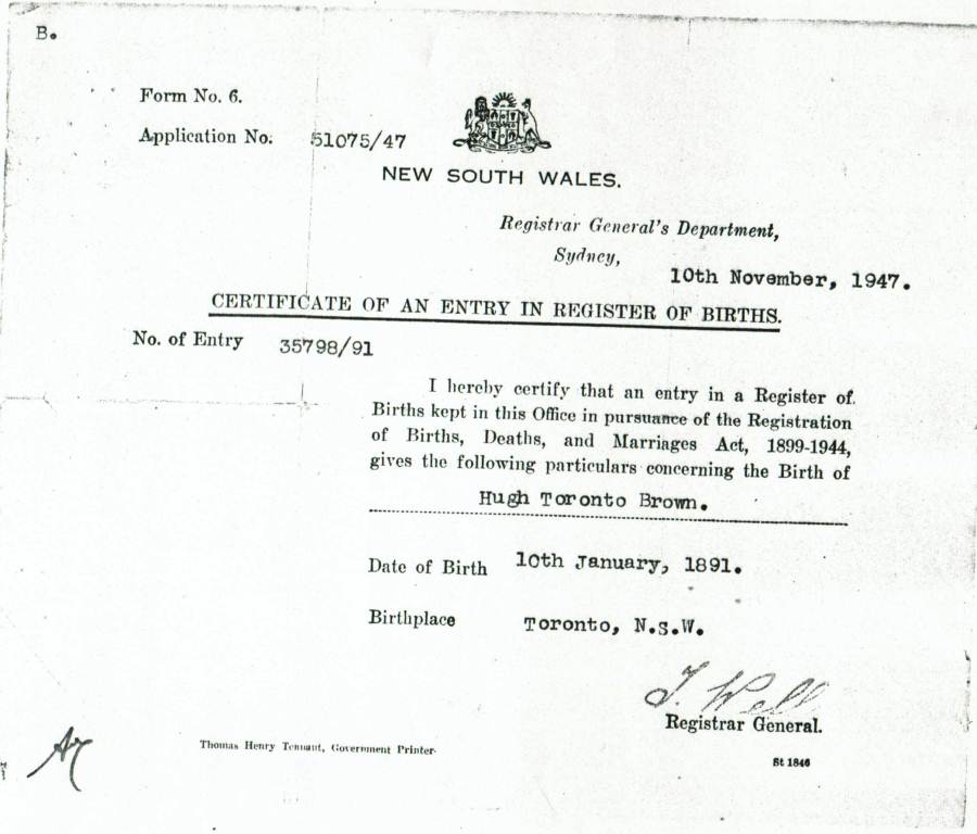 Birth Extract - Hugh Toronto Brown, 10 Jan 1891