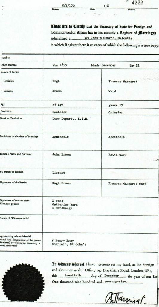 Marriage Certificate - Hugh Brown and Frances Margaret Ward, 22 Dec 1879
