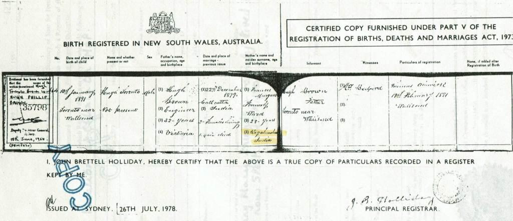 Birth Certificate for Hugh Toronto Brown, 10 January 1891
