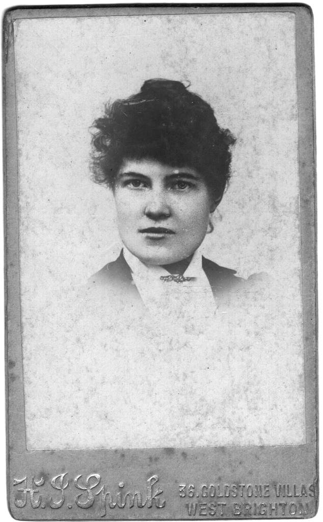 Thought to be Ada Morris. It has on the back "My Mother age 18" and was with the Barber family photographs. The photographer, H J Spink, died in 1892 when Ada would have been 18 years old, and the photo is from the 1890s period. This type of photograph is called a "midget carte" and was the smallest format available for a commercial portrait. It was introduced in the 1880s but did not become widely popular until the 1890s.