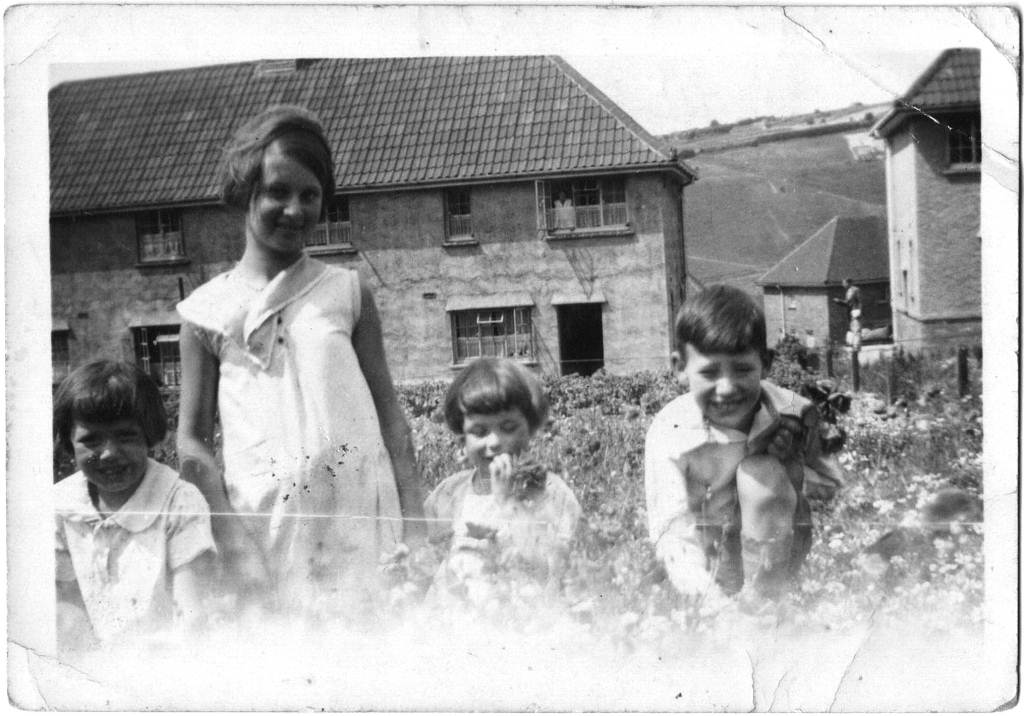 Freda taylor (the tallest) with Joyce, Winne and Ron August 1936. Is that Ada in the window?