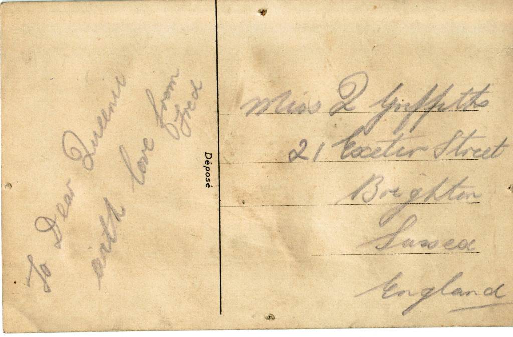 Postcard sent from France to Fred's sister Queenie (Victoria May) undated - back.