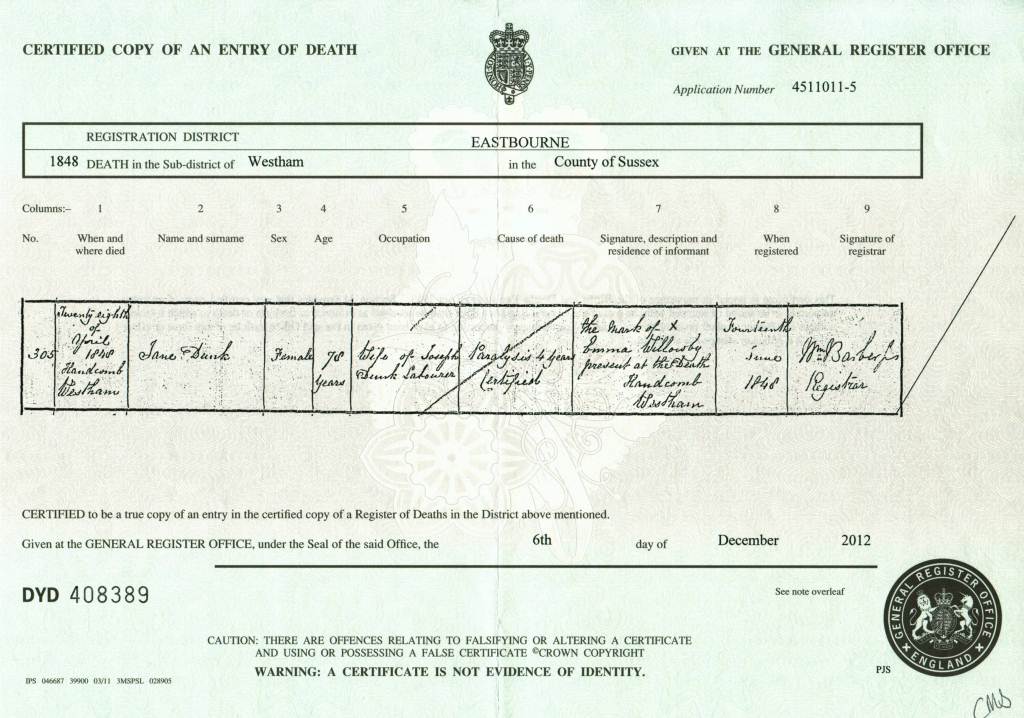 Death Certificate for Jane Dunk, 28 Apr 1848 at Westham, Sussex.