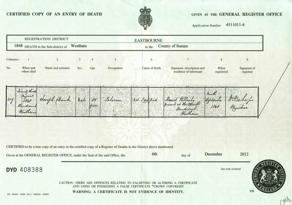 Death Certificate for Jospeh Dunk, 23 Aug 1848 at Westham, Sussex.
