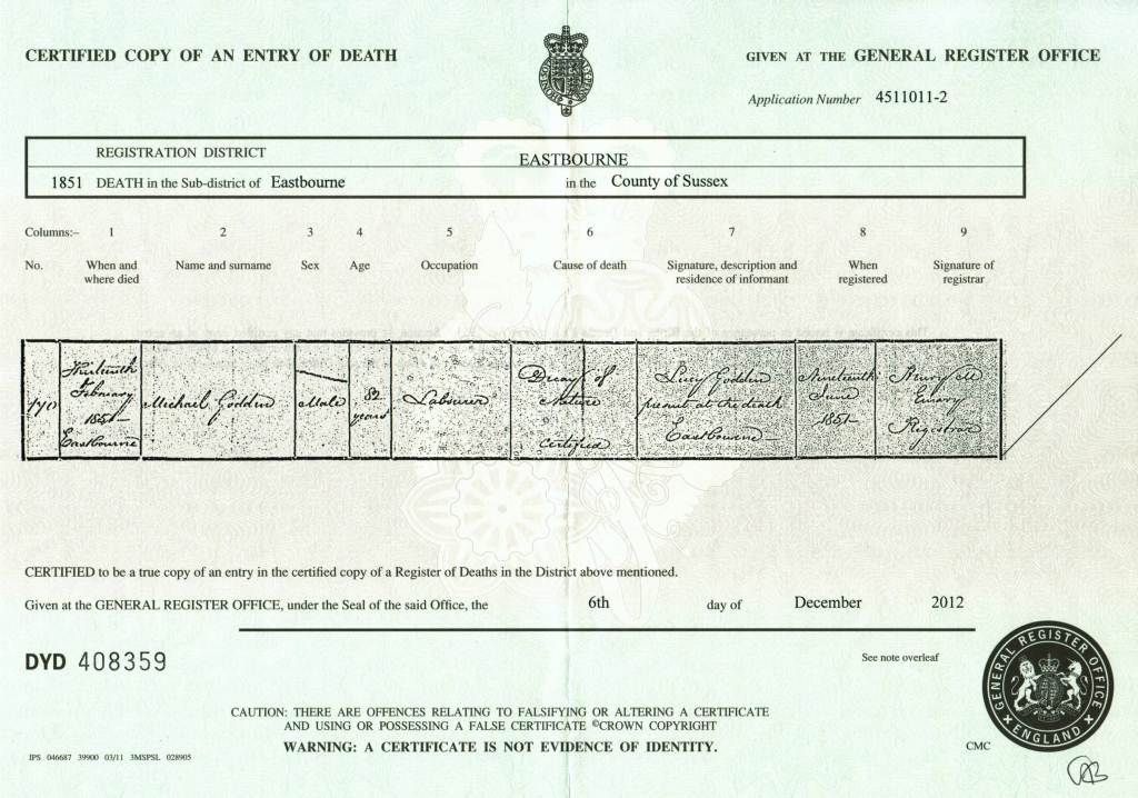 Death Certificate for Michael Godden, 13 Feb 1851 at Eastbourne, Sussex.