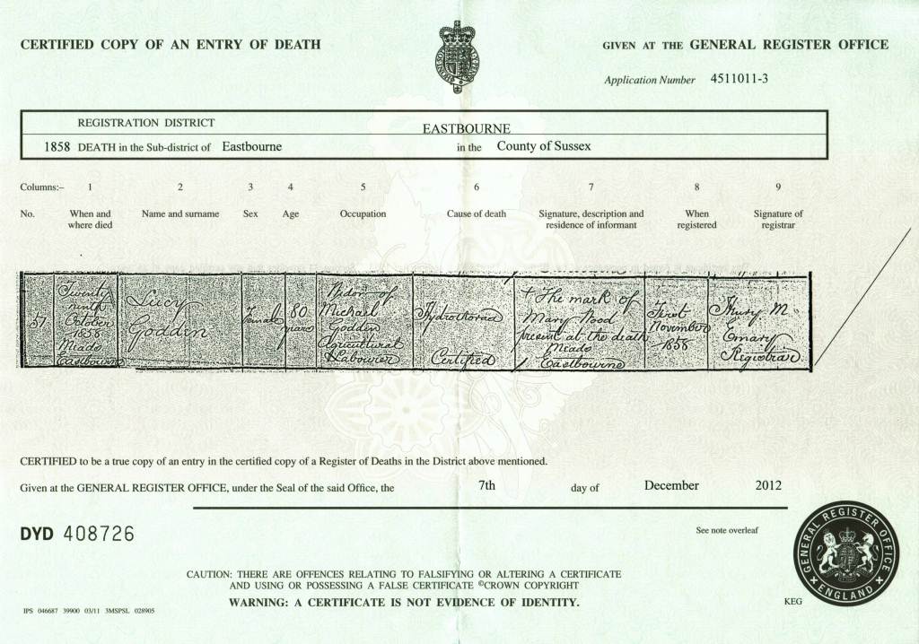 Death Certificate for Lucy Godden, 29 October 1858, Eastbourne, Sussex.