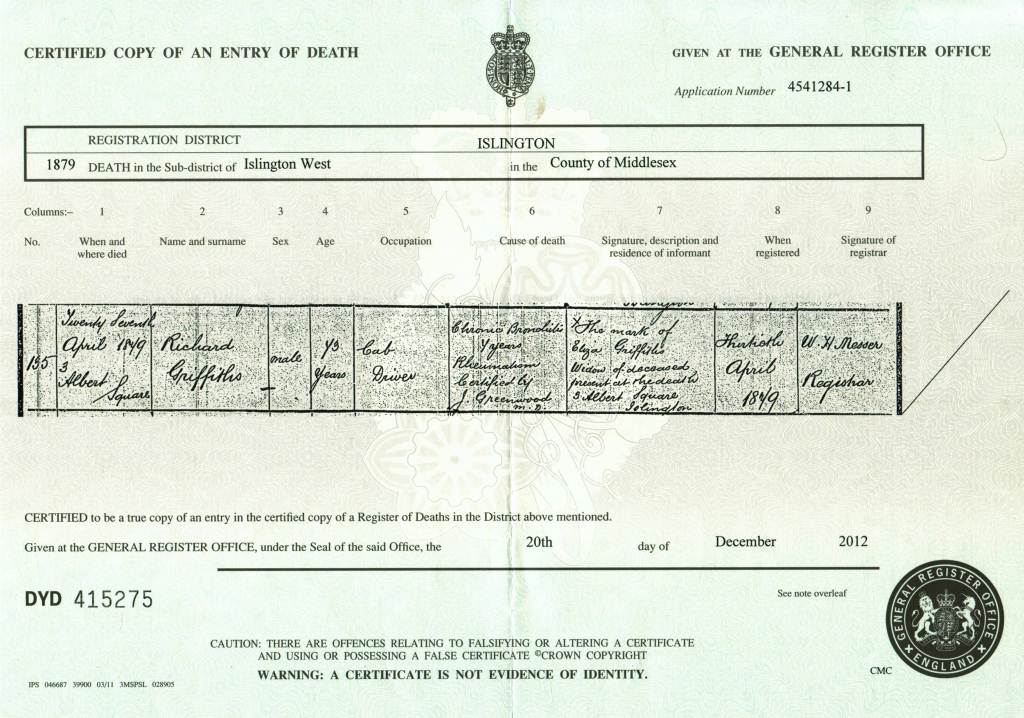 Death Certificate for Richard Griffiths, 27 Apr 1879