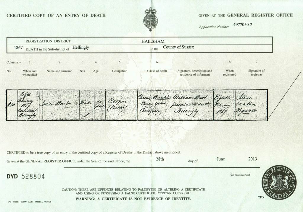 Death Certificate for Isaac Burt, died 5 February 1867 at Hellingly, Sussex.