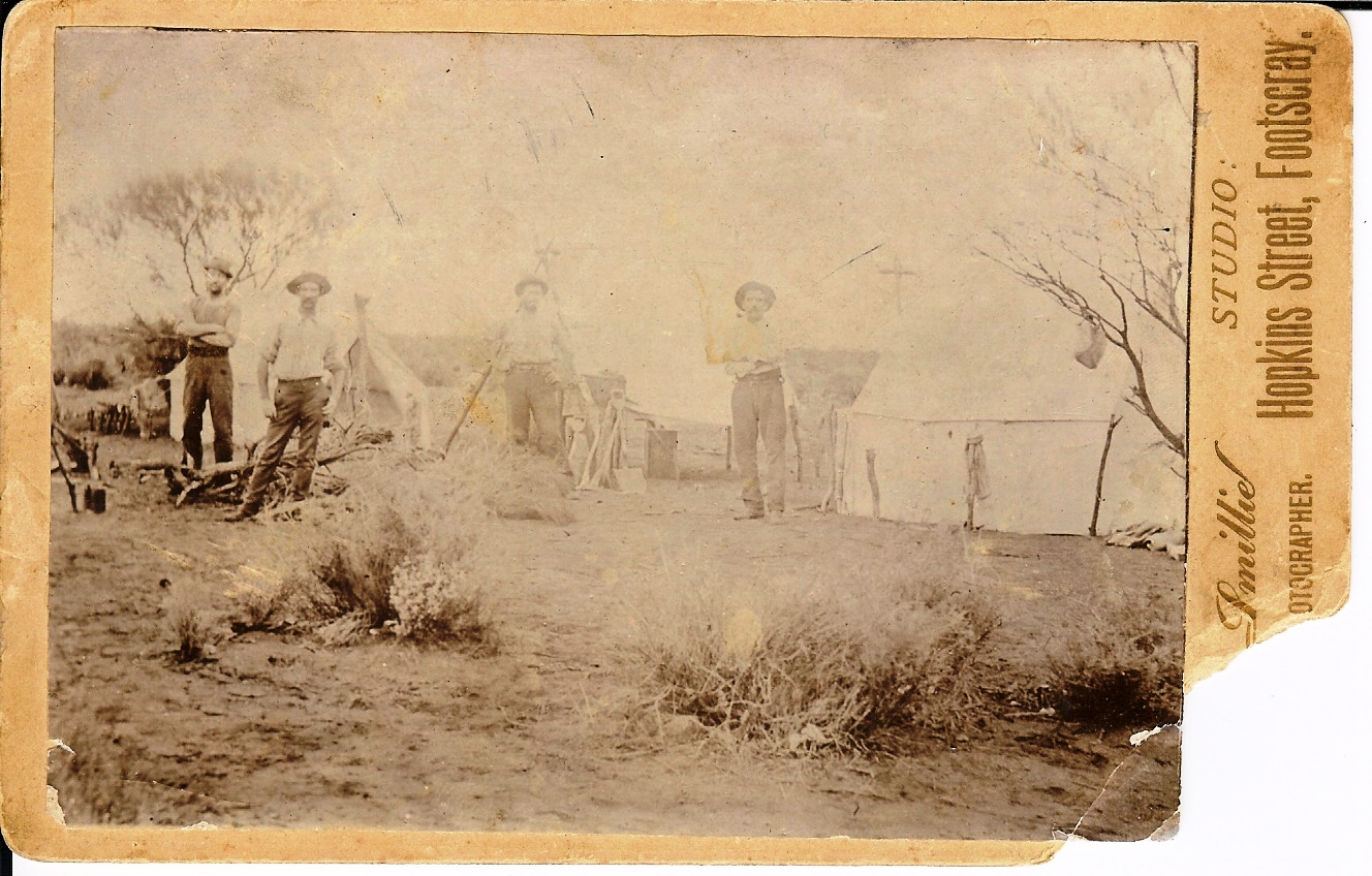 Frederick Wilkins (front with hands on hips), his Father James Wilkins (we think) far right, brother in law William Hollibone Birch back left, and an unknown person back right. Photo taken in the late 1870’s/80’s probably near Rutherglen.