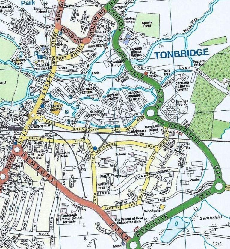 Modern map of Tonbridge. The location of Finches is marked with an "X".