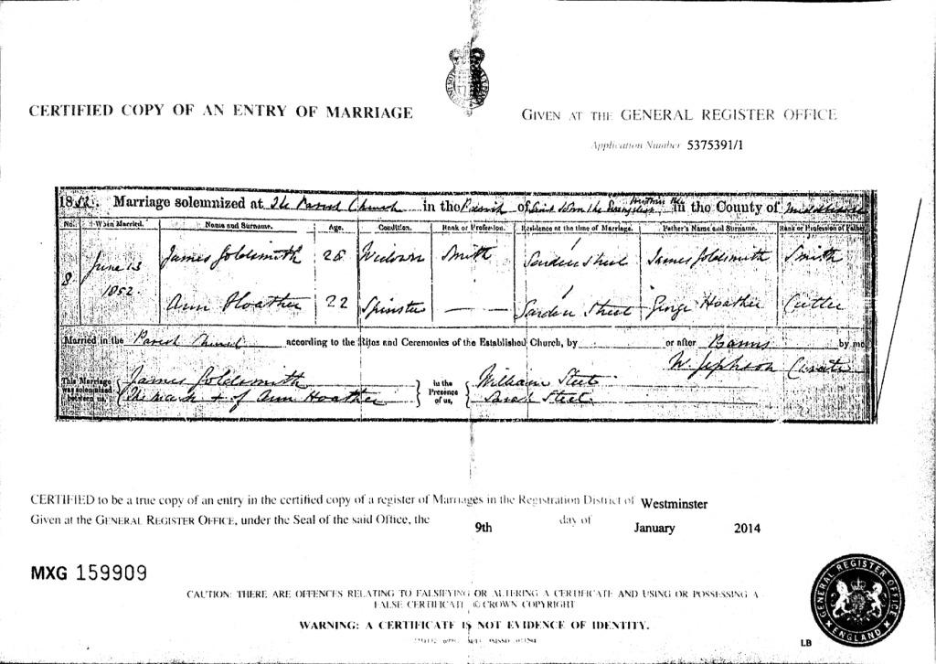 Marriage Certificate for James Goldsmith and Ann Hoather, 13 June 1852, at Westminster, London.