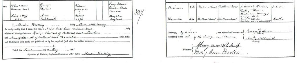 Marriage entry for George Havens and Ann Goldsmith, 1 May 1883 at Ballarat, Victoria.