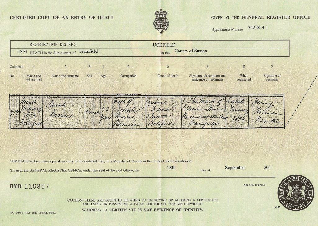 Death Certificate - Sarah Morris 1854