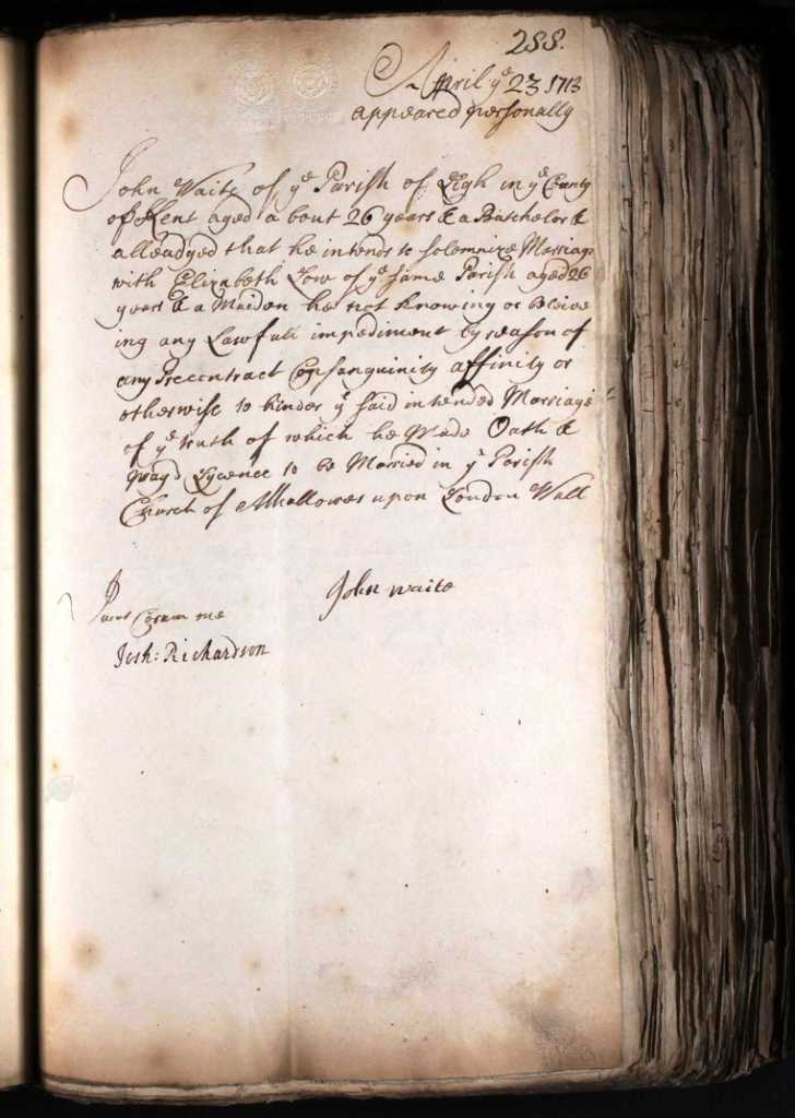 Marriage Allegation for John Waite (age about 26 years) and Elizabeth Low (age 26 years) both of Ligh[Leigh] in Kent.