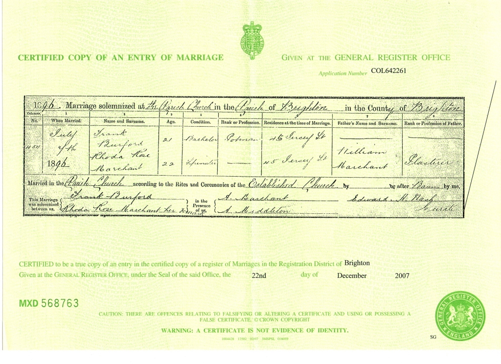Marriage Certificate of Frank Burford and Rhoda Rose Marchant 1896