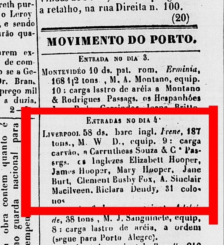 Newspaper reporting the arrival of Jane Burt in Rio Grande, Brazil on 4th February 1851.