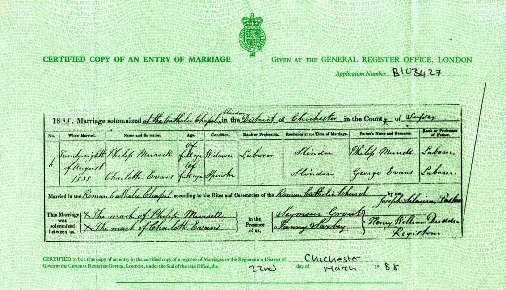 Marriage Certificate of Philip Murrell and Charlote Evans 1838