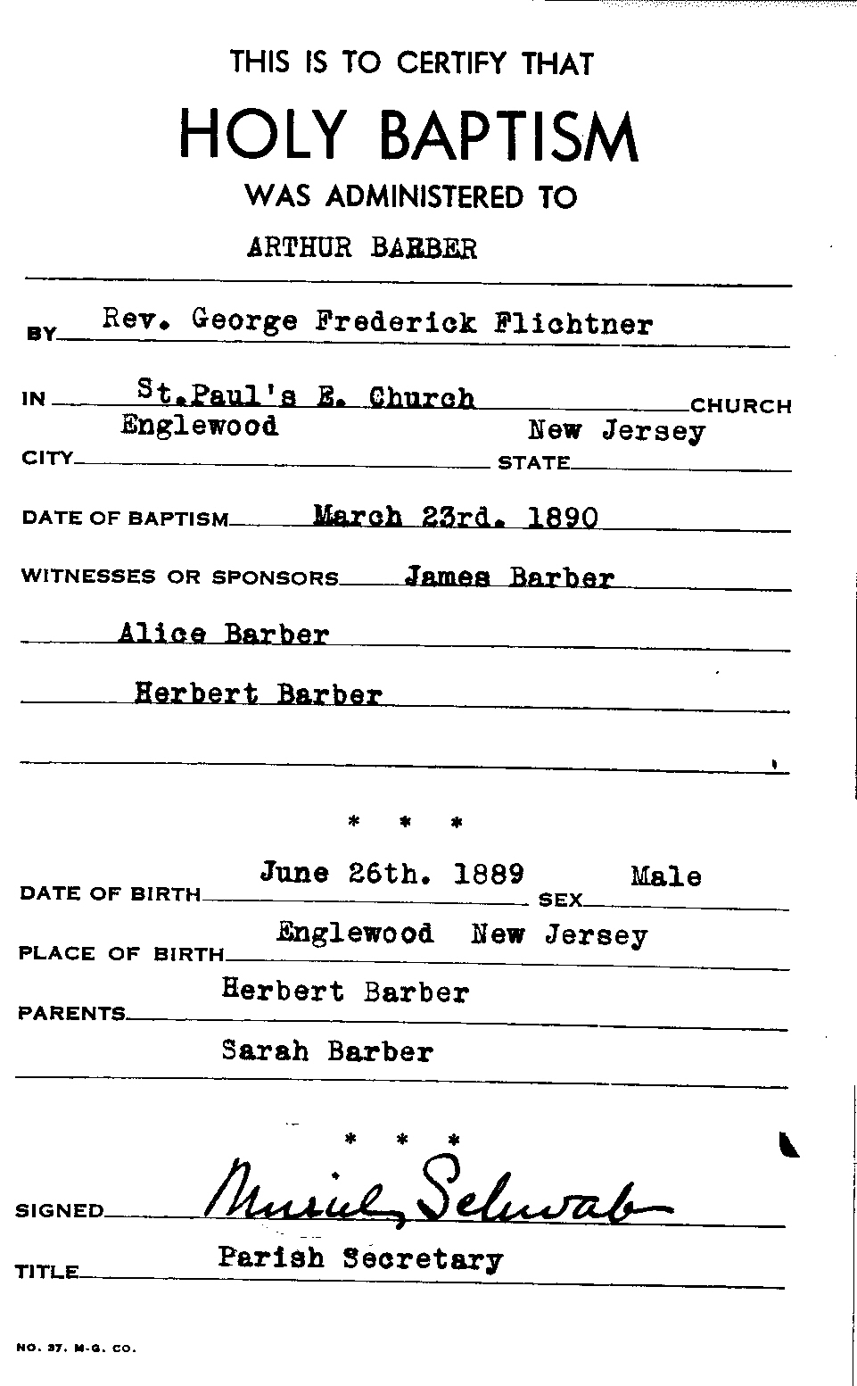 Baptism for Arthur Barber, 23 March 1890.