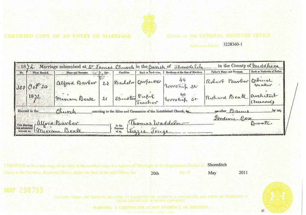 Marriage Certificate of Alfred Barber and Miriam Beall 1872