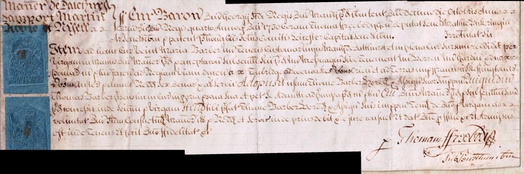Copy from the manorial court rolls recording the transfer of the Hildenborough property from Mary Barber to her son Thomas, 13 October 1730. (Tonbridge Library)