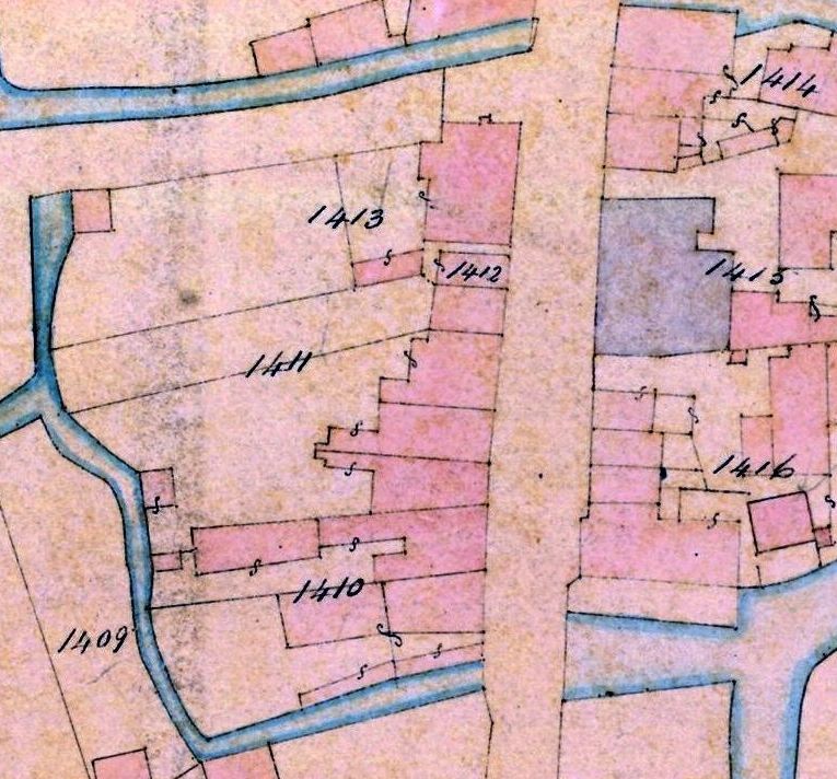 Tithe Map for Tonbridge 1838 showing on plot 1411 the four properties owned by Mary Barber. Note also plot 1415 across the road which is The Bull public house.