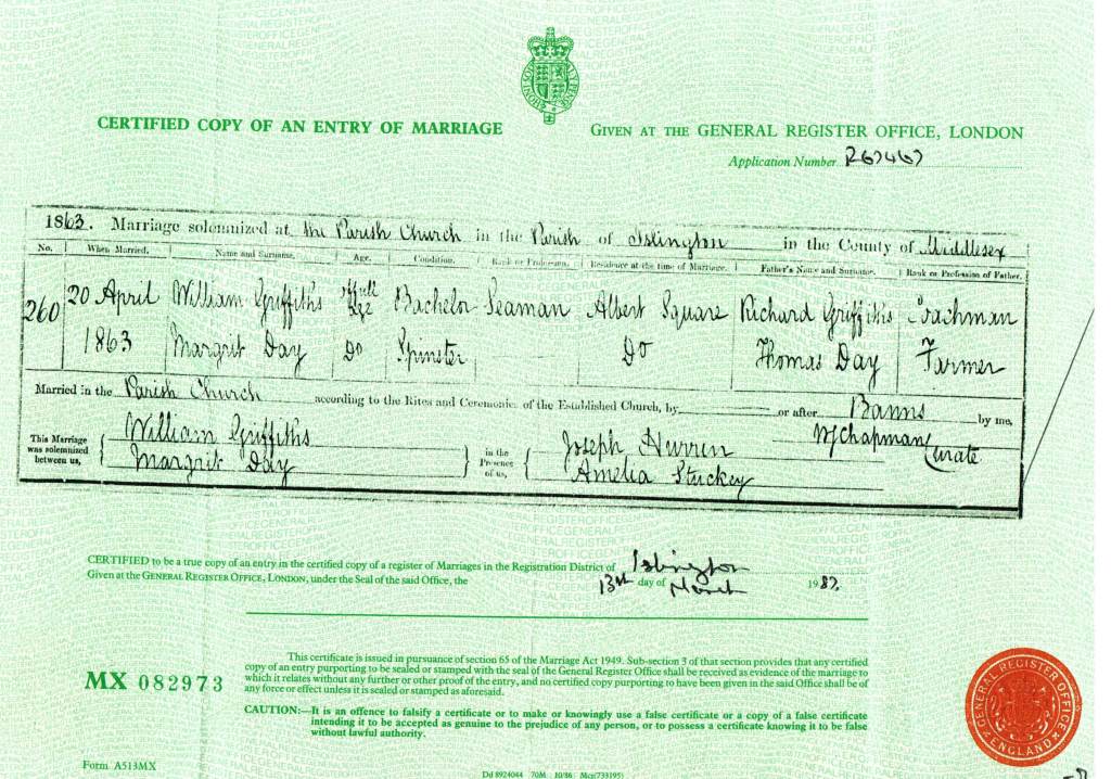 Marriage Certificate of William Griffiths and Margaret Day 1863