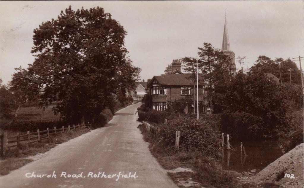 An early 20th-century postcard looking up Church Road (Rotherfield Hill) with Johnson's pond on the right. Note the Rotherfield St Denys church steeple. (Private collection of Geoffrey Barber)