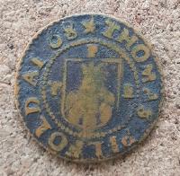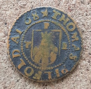 - Anecdote*: In 1668 he issued his halfpenny token at Henfield (Sussex BW96 N---- K56) which shows the “Mercers’ Maiden” surrounded by the initials for Thomas and Elizabeth Pilfold. The “Mercers’ Maiden”, taken from the Worshipful Company of Mercers’ coat of arms, was used on many 17th century tokens to identify the mercer’s trade.
